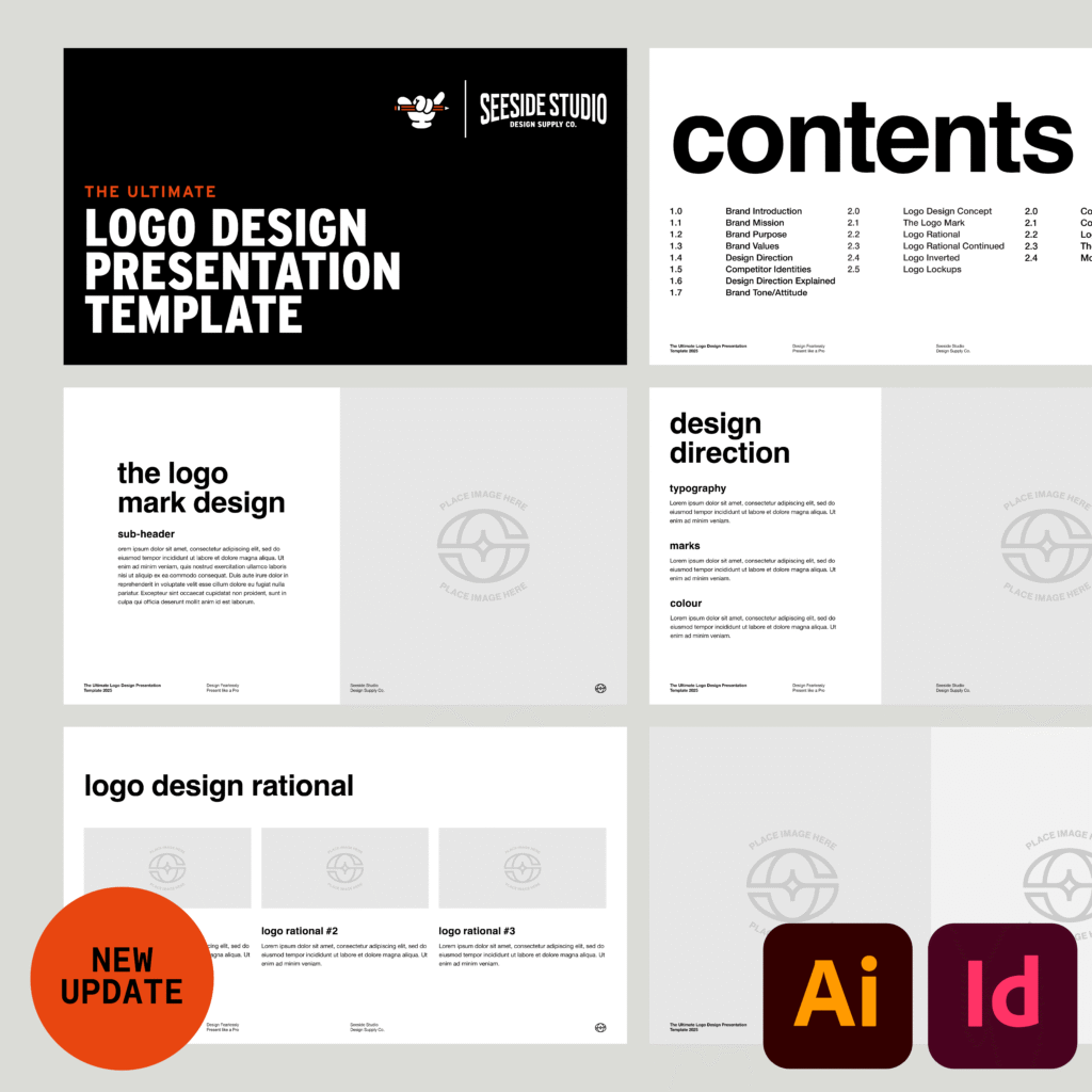 This is the exact template I use to present my logo design concepts to clients. Say goodbye to the stress of creating a presentation document for your clients with this awesome 30-page Ai. file template.